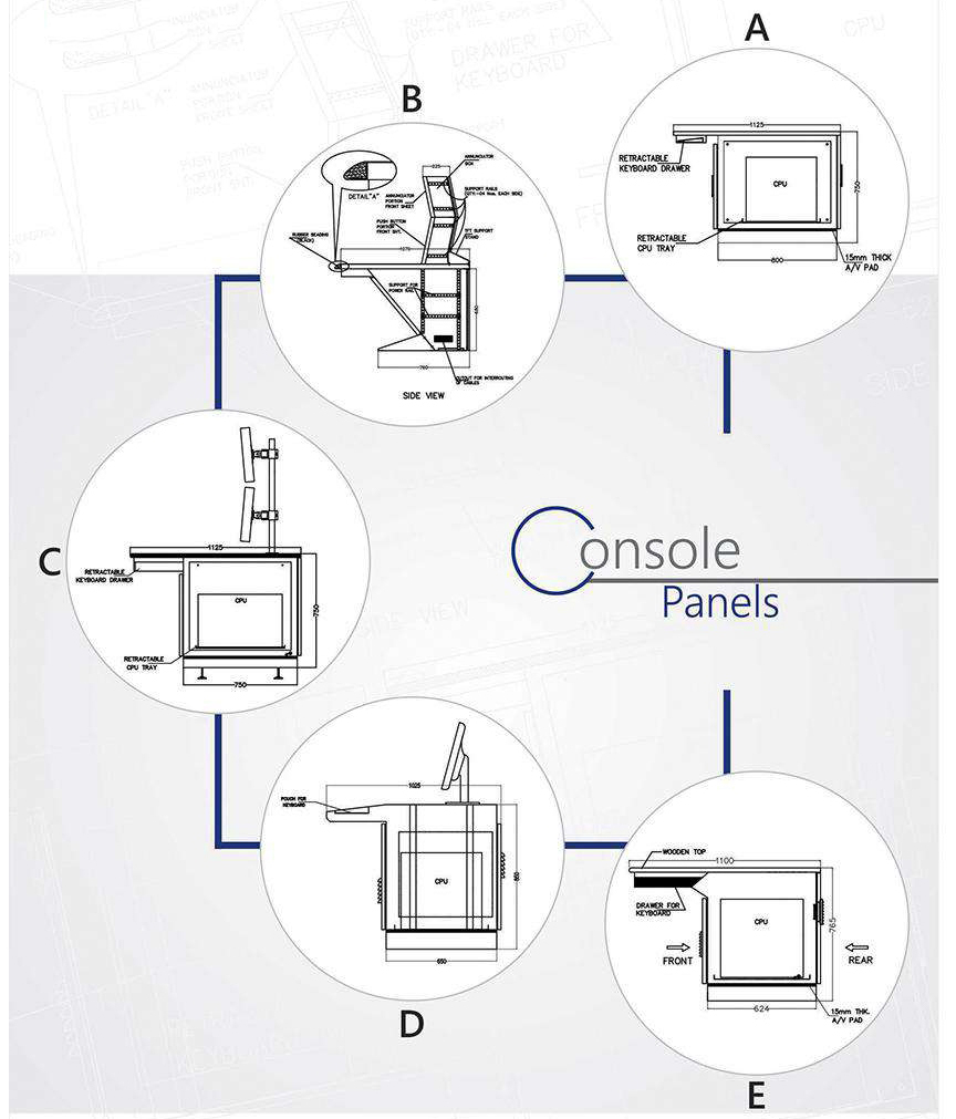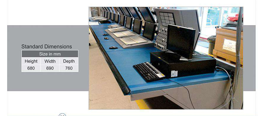 - The consoles are ergonomically designed for operator comforts & suitable for housing mounting personnel computers,21” CRT’s,19” racks mounted equipment, video monitors, distributor control systems & other items required in a control room environment.